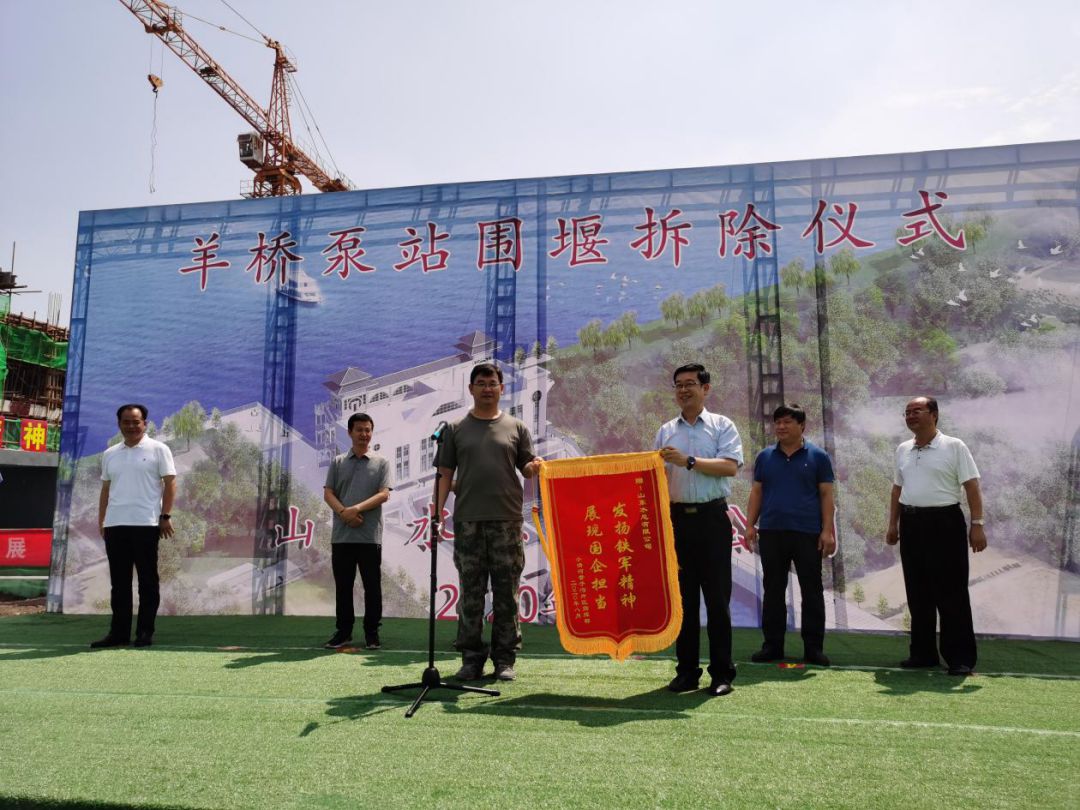 羊桥泵站闸门完全具备了启闭功能,水泵具备了排水功能,围堰的拆除标志着羊桥泵站的正式启用,为今年防汛防潮排涝提供了工程保障,对保证羊口镇人民生命财产安全具有重要意义。仪式上,王法顺部长代表工程指挥部给公司授予了锦旗,表达了对公司领导及参建职工的感谢,赞扬了水总人自强不息、勇于超越的铁军精神。