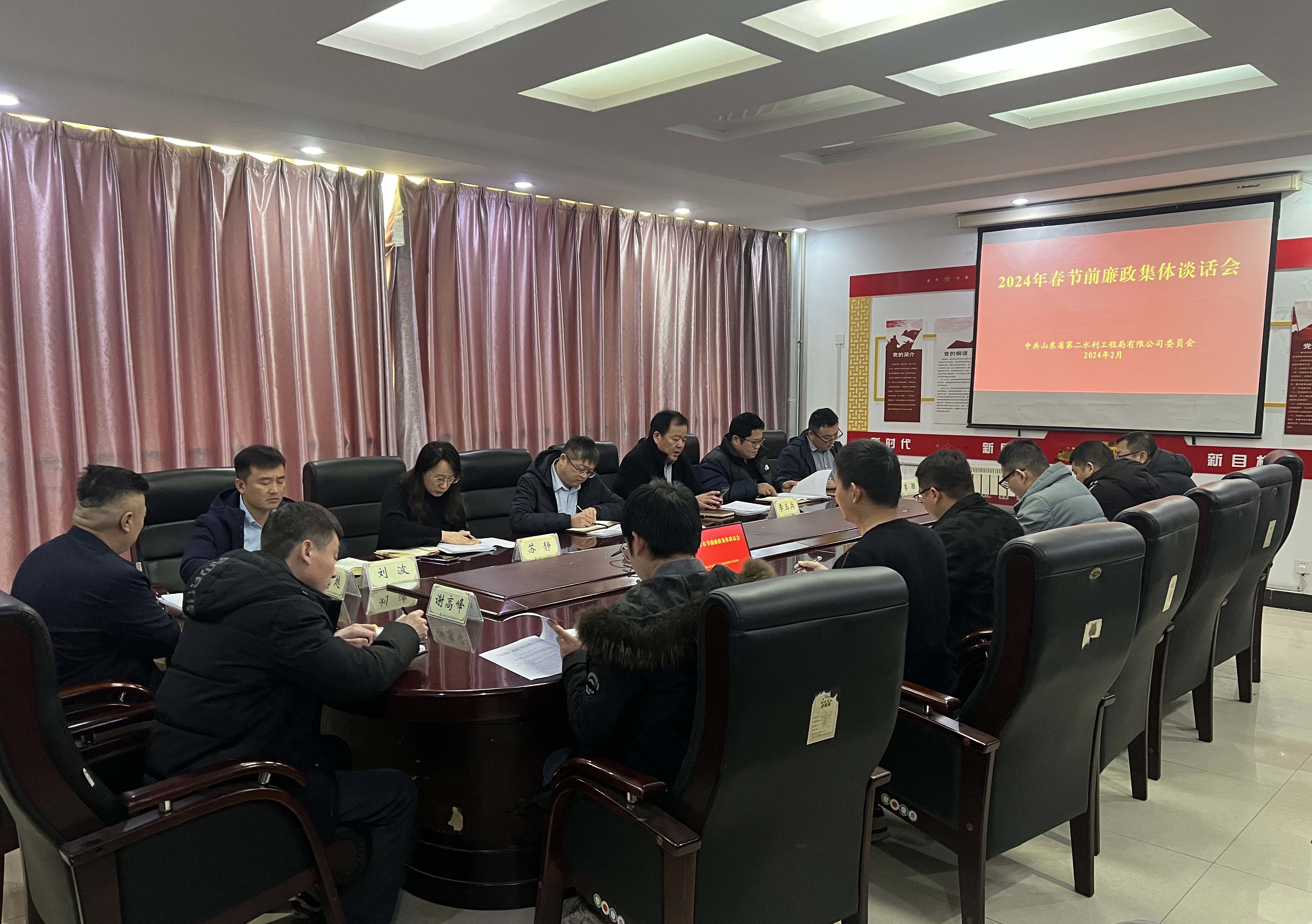 2月2日下午,二局有限公司党委召开2024年春节前廉政集体谈话会议。公司领导班子成员、各部室负责人和各项目负责人参加,二局有限公司党委书记、总经理王传波主持会议并就近期重点工作进行安排部署。